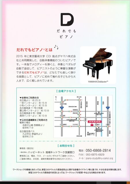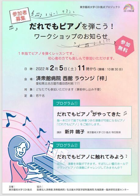 2022年2月5日11時~愛知県北名古屋市済衆館病院にて、グランドピアノでだれでもピアノを弾こうというワークショップが開催されます。東京藝大新井先生も来られます。「だれでもピアノ」を体験したい方は、ぜひお越しください。申し込みは不要です。
