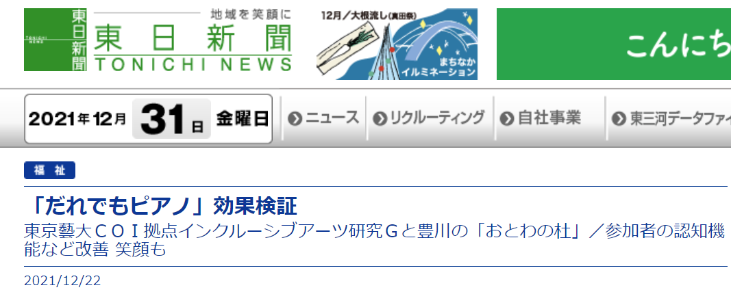 ところで、(一社)ハッピーネットが愛知県地区の事務局を担当した「だれでもピアノ研究」の調査のことが12月22日に東日新聞に掲載されました~~。